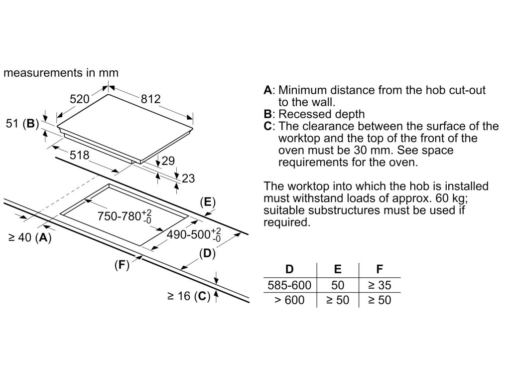 - rozměry pro vestavbu (V x Š x H): 51 mm x 750 mm x 490 mm