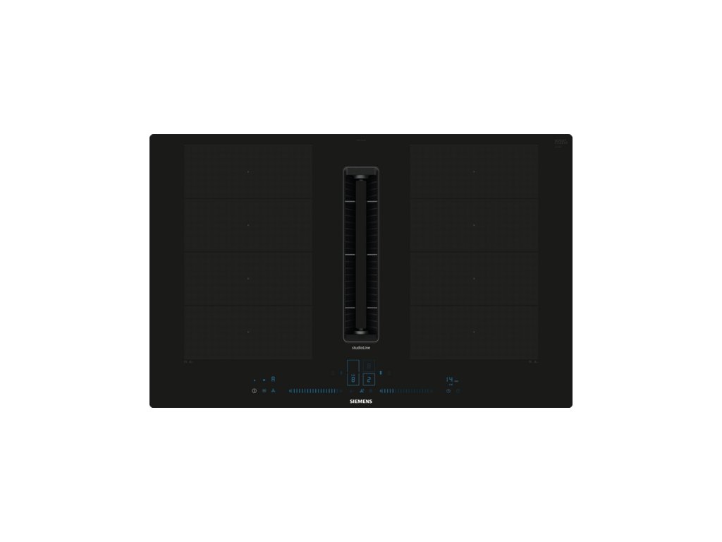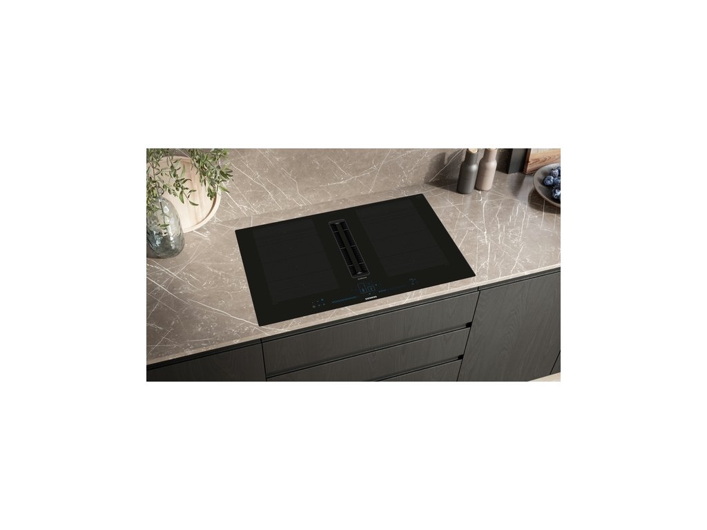 Elegantní varná deska se 4 varnými zónami o šířce 80 cm s plně integrovaným, zcela zapuštěným odsavačem par. Instalace do roviny pracovní desky - zápustný design.