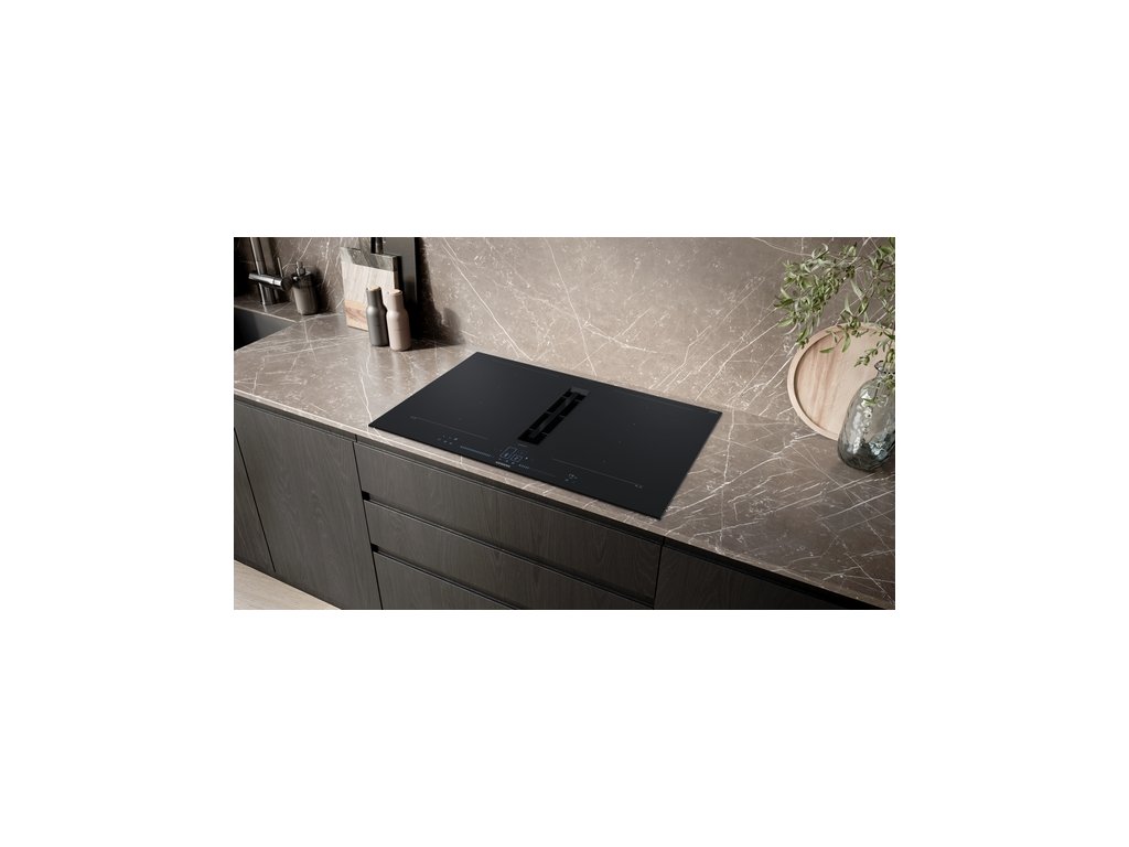 Elegantní varná deska s plně integrovaným, zcela zapuštěným odsavačem par v matném designu. Instalace na desku s rámečkem.